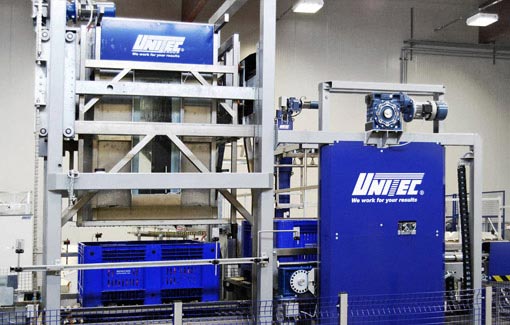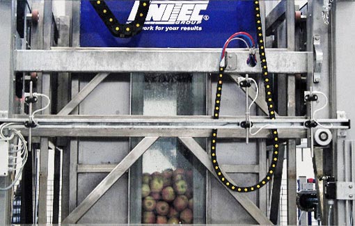 RBW 300 is an automatic bin filler extremely gentle which uses a special intake technology that create gradually the vacuum allowing a uniform and gentle filling of the apples inside the bins. It can be integrated with automatic labelling systems UNI TRACER and with the stacking robot UNI ROBOCLAMP.