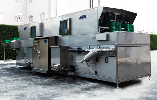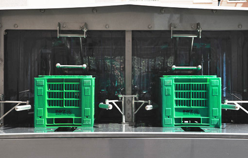 UNI BOX WASH is equipped with two parallel washing lines which operators supply manually, placing the dirty crates facing downwards.